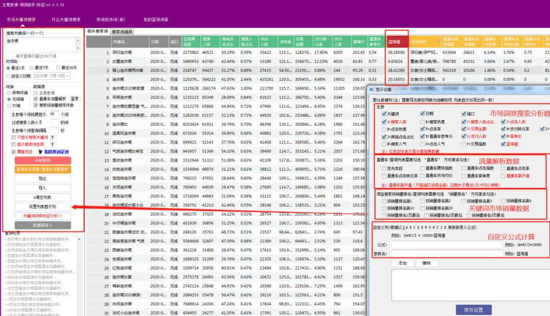 一键查询市场关键词、行业关键词和热词修饰词和蓝海词,支持多词同步查询。还支持一键组合标题,满足各种需求。